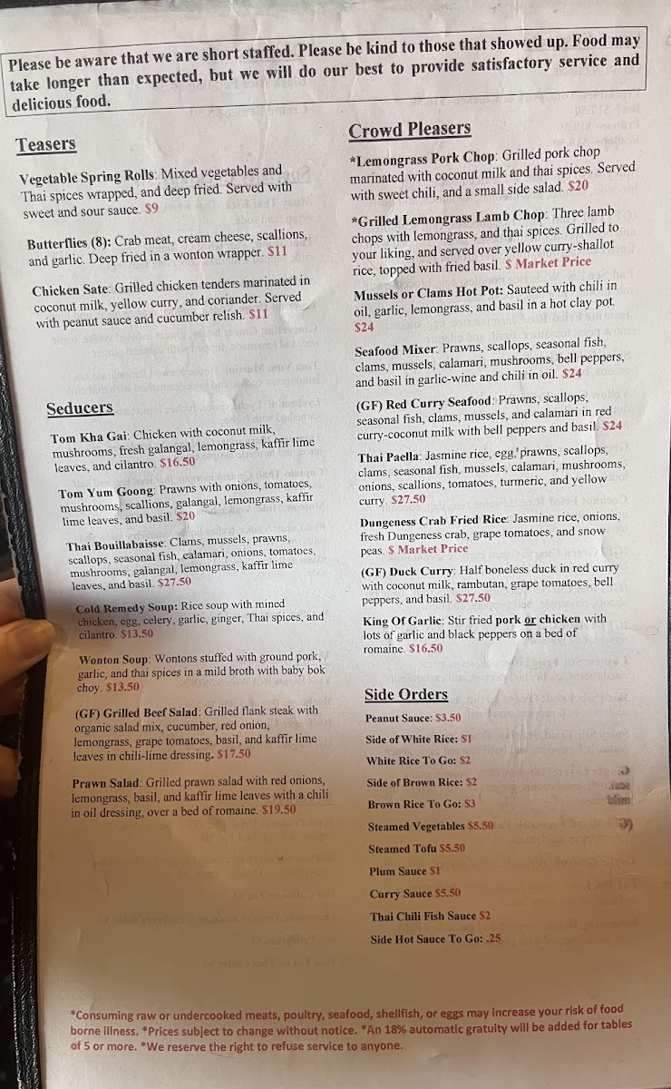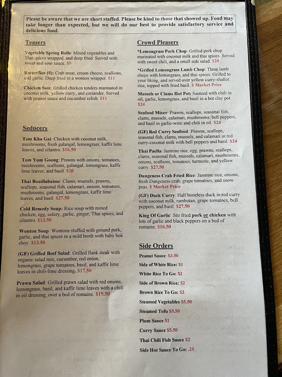 One bite of the Spicy Basil Noodles and you’ll understand why this dish is a customer favorite. Infused with aromatic basil and bursting with just the right heat, it’s a symphony of flavors that dances on your palate. For a satisfying comfort dish after a day of exploring the nearby Olympic National Park, don’t miss the Coconut Fried Rice topped with tender chicken—a filling option that blends the essence of Thai spices with rich coconut undertones. And for those who seek a real flavor explosion, the Dungeness Crab Fried Rice is an unforgettable treat, packed with succulent crab meat and a perfect balance of seasoning that leaves you craving more.