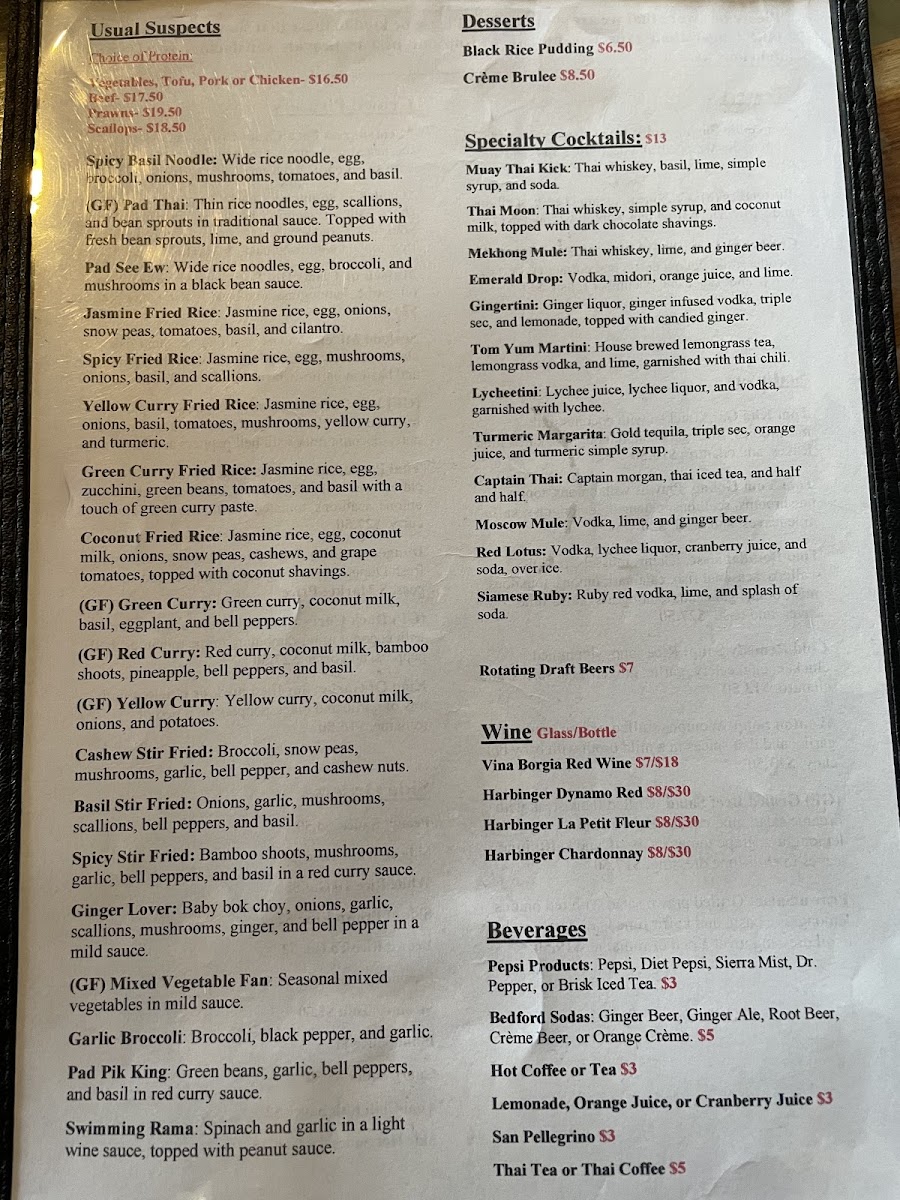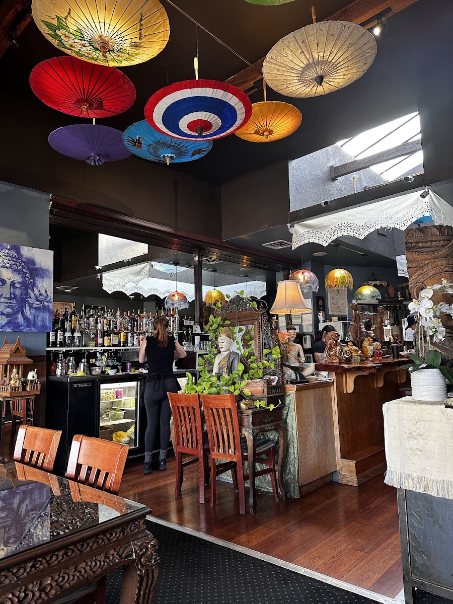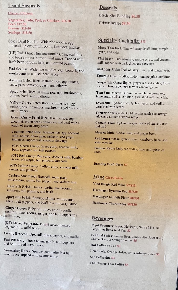 Pair your meal with one of their unique specialty cocktails, such as the signature Muay Thai Kick, which combines smooth Thai whiskey with fresh basil and lime, or the creamy Thai Moon crafted with coconut milk and a sprinkle of dark chocolate shavings for a touch of indulgence. If beer is more to your taste, opt for a refreshing bottle of Singha or explore their rotating draft options to complement your meal.